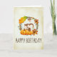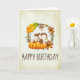 Um cartão de aniversário feliz perfeito para a temporada de outono. Projetado com um esquilo giro parado atrás de algumas abóboras cor de água laranja. Uma coroa foliar rodeia-os com uma folha de carvalho e flores laranja e outros ramos e folhas. TBackground é um pergaminho de vintage falso em uma cor creme, com um aspecto áspero. Dentro a placa é uma mensagem que você pode personalizar.