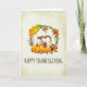 Um bom cartão de saudação de ação de graças dobrado. Projetado com um esquilo giro parado atrás de algumas abóboras cor de água laranja. Uma coroa foliar rodeia-os com uma folha de carvalho e flores laranja e outros ramos e folhas. O pano de fundo é um pergaminho vintage falso em uma cor creme, com um aspecto áspero. Mensagem personalizada no dentro.