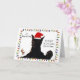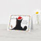 Cartão de Natal engraçado com um adorável gato preto usando um chapéu de Papai Noel e fazendo uma cara engraçada com a saudação "Está começando a cheirar muito a Natal".