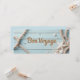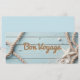 Um cartão de boas-vindas divertido com uma design náutica de cordas, estrelas e areia num pano de fundo de madeira azul.