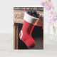 Uma grande reserva de Natal vermelha cheia de carvão pendura de uma manta de lareira esculpida de forma ornamentada. O texto pode ser alterado.