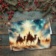 A frente deste cartão cristão de Natal tem uma bela apresentação dos três sábios (Magi) seguindo a Estrela de Belém enquanto procurava a criança Cristo. O dentro do topo tem a conta deles de Matthew 2, e o fundo tem a sua própria saudação e assinatura. Todo o texto é personalizável, portanto você pode substituir os versos por sua própria escolha, se desejar.