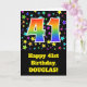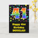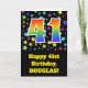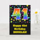 A frente deste design de empolgante, divertido e vibrante cartão de aniversário apresenta várias formas coloridas de estrelas, juntamente com o número "41", que apresenta um padrão de gradiente de espectro inspirado no arco-íris multicolor, num fundo preto colorido. A frente também apresenta uma mensagem de saudação de aniversário, incluindo um nome de destinatário personalizado. O dentro apresenta uma mensagem de saudação de aniversário personalizada, ou talvez possa ser apagado e deixado o vazio se uma mensagem for escrita manualmente. Um cartão de aniversário personalizado como este pode ser uma maneira divertida de enviar desejos de aniversário a alguém que comemora seu quarenta primeiro aniversário. [~Z0000348]