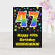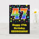 A frente deste design de empolgante, divertida e vibrante cartão de cumprimentos de aniversário apresenta muitas formas coloridas de estrelas, juntamente com o número "47" com um padrão de gradiente de espectro inspirado no arco-íris multicolor, num fundo preto colorido. A frente também apresenta uma mensagem de saudação de aniversário, incluindo um nome de destinatário personalizado. O dentro apresenta uma mensagem de saudação de aniversário personalizada, ou talvez possa ser apagado e deixado o vazio se uma mensagem for escrita manualmente. Um cartão de aniversário personalizável como este pode ser uma maneira divertida de enviar desejos de aniversário a alguém que está celebrando seu quarenta e sétimo aniversário. [~Z0000348]