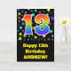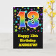 A parte dianteira destes excitação, divertimento, e características de design vibrantes do cartão do aniversário um teste padrão colorido do campo de estrela, junto com o número "13" tendo um espectro colorido do arco-íris gosta do teste padrão do inclinação, em um fundo colorido preto. A parte dianteira igualmente caracteriza uma mensagem do cumprimento do aniversário, incluindo um nome destinatário customizável. As características internas uma mensagem personalizada do cumprimento do aniversário, ou poderiam talvez ser canceladas e sairiam do vazio se uma mensagem deve ser escrita à mão pelo contrário. Um cartão de aniversário customizável como este pôde ser uma maneira do divertimento de enviar a uma mensagem em comemoração de alguém o décimo terceiro aniversário. [~Z0000348]