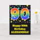 A parte dianteira destes excitação, divertimento, e características de design vibrantes do cartão do aniversário um teste padrão de estrelas colorido, junto com o número "90" tendo um arco-íris colorido inspirou o teste padrão do inclinação do espectro, em um fundo colorido preto. A parte dianteira igualmente caracteriza uma mensagem do cumprimento do aniversário, incluindo um nome destinatário customizável. As características internas uma mensagem personalizada do cumprimento do aniversário, ou poderiam talvez ser canceladas e sairiam do vazio se uma mensagem deve ser escrita à mão pelo contrário. Um cartão de aniversário personalizado como este pôde ser uma maneira do divertimento de enviar a uma mensagem em comemoração de alguém o aniversário ninetieth. [~Z0000348]