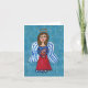 Este cartão de nota vazio tem um anjo patriótico da arte popular em um vestido do vermelho, o branco e o azul que guardara a bandeira dos EUA em um fundo azul com poucas estrelas do ouro.