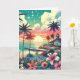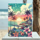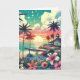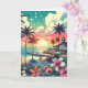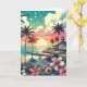 Cartão de aniversário tema praia. Linda vista do oceano turquesa, azul-turquesa e rosa com um pôr do sol e silhuetas de palmeiras, lindas flores tropicais e um píer e casa de praia.