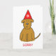 Um desenho de um cachorro marrom fofo, com um aspecto triste, com o chapéu de uma duna vermelha e a palavra "SORRY" escrita embaixo.