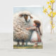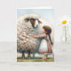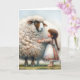 Uma garotinha com um vestido padronizado está admirando uma ovelha grande com um velo enorme e liso para eu te amar. O texto é editável.