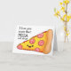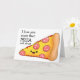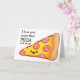 Cartão bonito para aquele que você ama. Uma fatia engraçada de pizza com queijo amarelo, pepperoni cor-de-rosa, crosta grossa e rosto feliz. No canto superior esquerdo estão as palavras Eu te amo mais que pizza, quase em texto preto.
