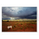 Brinquedo solitário (avião) num campo deserto de terra vermelha através de uma vasta paisagem intacta sob céus tempestuosos. À distância, o sol está se quebrando através das nuvens de tempestade.