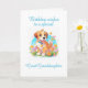 Um cartão de aniversário para uma neta excelente que ama um cachorro. Um filhote fofo sorrindo para dizer desejos de aniversário. Um cachorrinho marrom com flores e borboletas enviando desejos de aniversário.