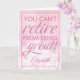 Um cartão de aposentadoria personalizado impressionante. Esta bela design de tipografia seria perfeita como um cartão de aposentadoria do escritório para enfermeiro, advogado ou professor. A citação 'Você não pode se aposentar de ser excelente' é apresentada em tipografia rosa em fundo de bolha rosa-claro. Adicione a sua própria mensagem e o nome dos destinatários para fazer um cartão de saudações pessoal e verdadeiramente exclusivo.