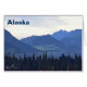 Montanhas azuis, água azul do lago, árvores verdes escuras, algas rosa e encharcadas. Uma representação do verão no extremo norte. A leitura de texto "Alaska" também é exibida. Mosquitos não incluídos.