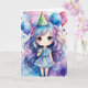 Faça o aniversário de alguém realmente mágico com este cartão personalizável com uma charmosa garota chibi. Com seu lindo cabelo azul, vestido de festa encantador, e chapéu festivo, ela se coloca entre balões coloridos e salpicos de aquarela, trazendo à celebração uma atmosfera de conto de fadas. Este cartão é perfeito para as crianças e para quem ama designs bonitinhos e sonhadores. Personalize a mensagem dentro com seu toque pessoal para torná-la ainda mais especial. Ideal por adicionar um borrão de magia ao dia especial da aniversariante, este cartão certamente trará sorrisos e alegria. Celebre em estilo com este cartão de aniversário delicioso e personalizável!