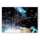 Esta é uma fotografia de um soldador cercado por faíscas.