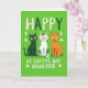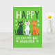 Este cartão apresenta três gatos estilizados alinhados na frente e no centro sobre um fundo verde-limão brilhante, dando a toda a cena um visual festivo de Dia de São Patrício 💚. Um gato é verde-esmeralda, o próximo é branco com manchas verdes semelhantes a trevos, e o terceiro é um tabby laranja, todos sentados lado a lado como se estivessem posando juntos. Seus olhos amarelos e narizes rosados minúsculos adicionam um charme sedutor, e os pequenos dentes brancos à mostra fazem com que pareçam estar compartilhando uma piada interna com o espectador. O olhar firme e frontal dos gatos parece um cutucão amigável destinado apenas a uma filha, com o espaçamento próximo do trio sugerindo um vínculo aconchegante e afetuoso. No topo, “FELIZ” está escrito em letras alternadas verde-escuro e branco, espaçadas uniformemente acima de suas cabeças. Ao longo da parte inferior, “DIA DE SANTA GATINHA FILHA” aparece em texto branco grande, centralizado e fácil de ler, com pequenos trevos brancos flutuando ao redor ☘️. O fundo