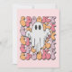 Este divertido e festivo design de Halloween apresenta uma clássica ilustração de fantasma na frente e no centro, rodeada pela palavra "Assustador" repetida em uma fonte ousada e borbulhante. O texto é sobreposto em cores vibrantes e inspiradas no retro, como tons suaves de rosa, roxo e laranja, criando um contraste divertido com a figura simples e branca da fantasma. Os olhos pretos sem expressão da fantasma adicionam um toque de charme assustador, enquanto a tipografia ondulada e empilhada dá ao design um clima groovy e nostálgico.