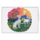 Um gato Rex de Devonshire branco é o foco nesta design chamada Terra Fantasia que inclui um castelo ouro numa colina perto de um rio azul de cristal, um unicórnio mágico, e uma pomba de paz.