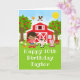 Este cartão de aniversário bonito e divertido pode ser personalizado com um nome ou título como filha, neta, sobrinha, amiga, etc. Ele apresenta uma cabeleireira castanha com pele escura ao lado de um celeiro vermelho com um furacão de galo. Há animais de fazenda adoráveis como uma vaca, porco e galinha. Ao fundo está um céu azul brilhante, macieiras, sol, borboletas e margaridas. O texto combina fontes em negrito e sans serif para uma aparência na moda e moderna. Isto é perfeito para uma festa de aniversário temática fazenda.