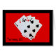 Uma fotografia de cinco cartas de jogar - um 2 De Espadas, 3 De Corações, 4 De Pinos, 5 De Ouros e 6 De Espadas - é o tema do meu "Turning 20 é um grande negócio!" cartão de aniversário. As cinco cartas, que totalizam 20 pontos, aparecem bem sobre o fundo vermelho brilhante.