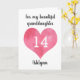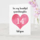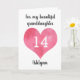 Um cartão personalizado de 14 de aniversário para a neta que tem um coração a aquarela. Você pode personalizar o coração aquarela com a idade que você precisa e adicionar seu nome embaixo do coração. A mensagem do cartão de dentro lê uma mensagem de aniversário sincera, que também pode ser facilmente personalizada se quisermos.