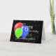 Um cartão de aniversário para o aniversário de 16 anos de uma neta com fundo preto, um balão azul, vermelho e verde e espirais e estrelas dispersas.