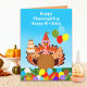 Celebre um aniversário que cai perto ou no Dia de Ação de Graças com esta design divertida! Um peru alegre segura um bolo de aniversário decorado em cores quentes do outono junto com balões festivos. Mais balões descansam no chão, cercados por folhas coloridas de outono, fazer esta a celebração perfeita de aniversário com uma reviravolta de outono.