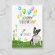 Celebrar um aniversário especial com este cartão alegre, com um belo Bulldog Francês sentado num campo de flores sob um céu de balões coloridos. Este design é perfeito para amantes franceses e para quem gosta de uma saudação de aniversário brilhante e feliz.