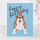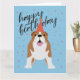 Esta carta de boas-vindas de aniversário apresenta um touro feliz num chapéu de aniversário com as palavras "feliz aniversário"
