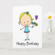 Garota bonita de cartoon com cabelo amarelo e vestindo um vestido azul com um colar rosa está segurando um monte de flores coloridas com uma bonito borboleta fluindo ao redor. Abaixo estão as palavras Parabéns em letras negras.