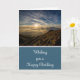 Cartão do feliz aniversario com um Mountain View cénico com neve sobre a montanha e a luz solar que quebram através das nuvens.