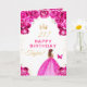 Este cartão de aniversário elegante e glamouroso pode ser personalizado com um nome ou título como filha, neta, sobrinha, amiga, etc. O design apresenta uma bela princesa com cabelo castanho num vestido de bola rosa quente. O texto combina o script manuscrito e as fontes sans serif modernas para um aspecto elegante e sofisticado. Os arranjos florais, borboletas e confete de ouro criam a mistura perfeita de rústicos e quicos. Gráficos por www.etsy.com/uk/shop/SunflowerDayLove