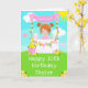 Este cartão de aniversário bonito e caprichoso pode ser personalizado com um nome ou título como filha, neta, sobrinha, amiga, etc. Ela apresenta uma cabeleira vermelha com pele justa em um assento de limonada rosa que é decorado com flores e bunting. Ao fundo está um céu azul, sol e borboletas. O texto combina fontes decorativas e sans serif para um aspecto na moda e moderno. Isto é perfeito para uma festa de aniversário de verão. Gráficos de MUJKA