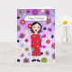 Feliz aniversário para você, meu querido amigo. Bonito flores roxas e uma dama de cabelo preto desenhado de uma forma desagradável.