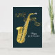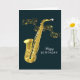 Um saxofone dourado e uma linha de notas musicais decoram a parte dianteira deste cartão do feliz aniversario. Grande escolha especialmente para uma quem joga o saxofone.