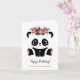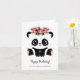 Uma linda garota de panda, feliz cartão de aniversário. Urso panda preto e branco do estilo Kawaii com coroa floral. Texto personalizado.