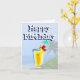 Os coquetéis de bebidas com guarda-chuva frutado numa praia tropical criam um cartão de boas-vindas de feliz aniversário para qualquer idade. Água do oceano azul, palmeiras e o guarda-chuva onipresente de papel. A saudação de texto pode ser personalizada. Mostrado em um tamanho de placa.