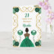 Este cartão de aniversário apresenta uma elegante estrutura dourada, uma bela princesa com pele escura e um vestido verde esmeralda, flores e um balão.
