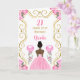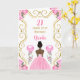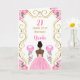Este convite de aniversário apresenta uma elegante estrutura dourada, uma bela princesa com pele escura e um vestido cor-de-rosa, flores e um balão.