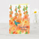 Um cartão floral brilhante de cumprimentos de aniversário para uma tia decorada com um jardim de hollyhocks cor de laranja no cheio, com um beija-flor azul turquesa feliz visitando a mão pintada com aquarela. Você pode personalizar o texto e a cor do dentro para ajustado das suas necessidades.