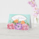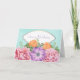 Um cartão de saudação de aniversário feliz com um dentro de mensagem que pode ser personalizado, alterado ou deixado como está. O design é um belo buquê de flores de aquarela, formadas por pedras cor-de-rosa, anêmonas roxas e tulipas laranja cercadas por folhas verdes. Um quadro oval rico com uma borda dourada diz Feliz dentro de Aniversário. O fundo é uma textura macia de cor verde-aquática.