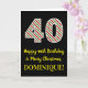 A frente desta divertida e simples carta de saudação de aniversário de 25 de dezembro, com tema de Natal e tema de aniversário, apresenta um grande número "40" com um padrão verde/branco/vermelho de listras, juntamente com a mensagem "Feliz aniversário de 40 anos e Feliz Natal", e um nome personalizável. O fundo da frente é preto colorido. O dentro apresenta uma mensagem de saudação de aniversário personalizável, ou talvez possa ser apagado e deixado o vazio se uma mensagem for escrita manualmente. Um cartão de aniversário personalizado como este pode ser uma maneira divertida de enviar desejos de aniversário a alguém que comemora seu quadragésimo aniversário e que também foi nascer no 25 de dezembro (Dia de Natal). [~Z0000405]