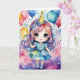 Uma ilustração colorida com aquarela de uma menina de olhos largos com cabelo fluido do arco-íris, vestindo um vestido azul e verde com o número "5". Ela segura um balão amarelo e veste uma festa listrada de ouro que adorava com flores azuis. O fundo está cheio de balões vibrantes e pedaços festivos de cor em tons roxos, roxos e azuis, criando uma alegre cena de aniversário.