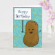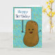 Um desenho animado e marrom feliz batata com um sorriso feliz no rosto. Ele está segurando um cartaz com uma modelo de texto lendo Feliz Aniversário. Altere o plano de fundo para qualquer cor escolhida clicando em personalizar.