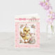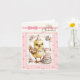 Um cartão bonito com um pintinho amarelo num chapéu de festa, uma vila floral e um bolo pastel. Adorado com listras e flores cor-de-rosa, lê-se: "Feliz Frango de Aniversário!"