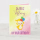 Personalize este cartão de aniversário de Feliz aniversário. Este cartão encantador apresenta um fundo cor-de-rosa e amarelo, com "Querido" escrito no topo com uma fonte roxa. Embaixo há uma modelo para inserir um nome. Há uma coruja segurando balões no meio com "No seu aniversário" escrito em fonte divertida. O dentro do cartão tem uma mensagem adorável. Faça seu pedido hoje!