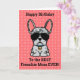 Frenchies, mostre a sua mãe um pouco de amor no seu aniversário com um cartão personalizado de você. A mensagem na frente do cartão diz: "Parabéns para a Melhor Mãe Francesa!" A mensagem dentro diz "Eu te amo mais do que guloseimas, Feliz Aniversário." O design apresenta uma ilustração do estilo de desenho animado de um buldogue francês, de cor azul, macho, vestindo um colarinho azul e óculos escuros do aviador preto. A cor da fonte e do plano de fundo e ser alterada selecionando "Clique para personalizar mais".