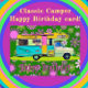 Faça-os sorrir com este cartão de aniversário brilhante. Um colega clássico colorido de ônibus, azul-turquesa vibrante, verde limão, laranja tangerina, e rosa, senta-se contra um fundo alegre de flores mod. Feliz Aniversário está na frente da carta em letras rosa brilhantes esboçadas em roxo. O fundo retrofloral é verde abacate, verde limão, rosa claro, violeta e lilás. A metade superior do dentro da placa tem faixas coloridas. A saudação dentro diz: "A alegria está na viagem. Divirta-se lá fora e faça um aniversário incrível! Há modelo para o nome do destinatário e o seu nome. Há também um modelo nas costas para o mês e o ano. Quem ama aventuras de acampamento, ou é viagem, amará essa carta única e divertida.